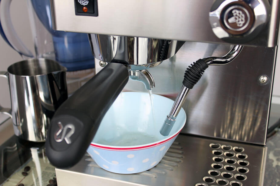 7. Lad vandet løbe indtil du har brugt cirka 1/3 af vandet i vandtanken. Vandet skal løbe gennem både filterkurven og igennem steameren. Når der er løbet 1/3 vand igennem, stopper du espressobrygningen og lukker for varmvandshanen igen.